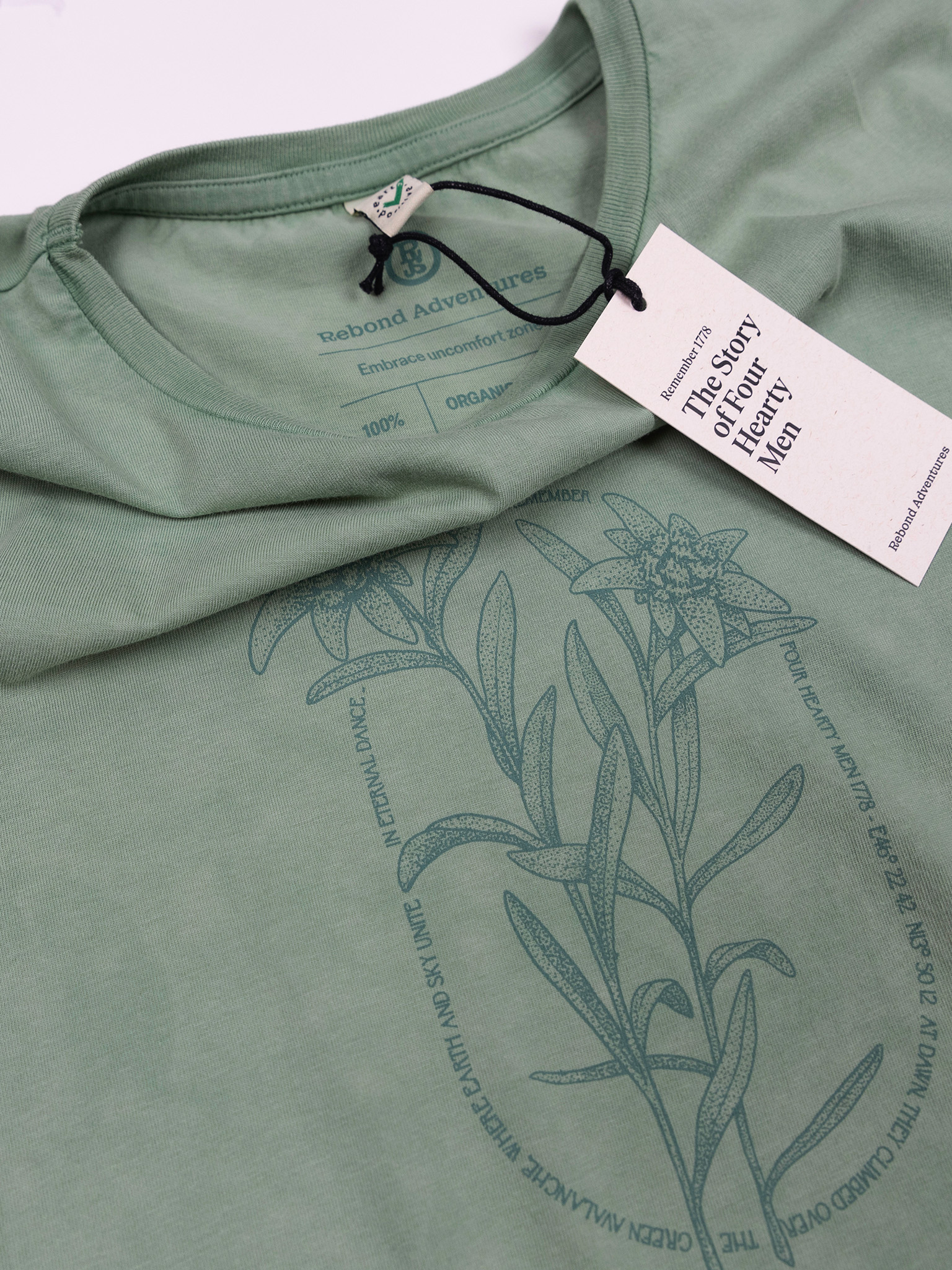 Remember Four Hearty Men 1778. At dawn, they climbed over the green avalanche, where earth and sky unite in eternal dance. Tee is crafted from 100% premium organic natural cotton, ensuring a Tee that is not only supremely comfortable but also ethically produced. It stands as a testament to the possibility of producing cotton clothing without any detrimental effects to the Earth’s soil, water, inhabitants—whether they be animals, plants, or people—or to its climate. Embodying the pinnacle of sustainability, it boasts a 90% reduced carbon footprint compared to standard apparel, making it one of the most eco-friendly clothing options available on Earth. Its production adheres to the highest standards of ethical manufacturing, prioritizing both the environment and human welfare.